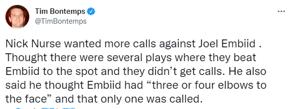 赛后纳斯盛赞76人今天打得很好,不过谈到关于恩比德的吹罚时,纳斯不满裁判的吹罚:我希望能有更多对恩比德的判罚,我感觉比赛中有几次,我们都攻击恩比德成功,却没有得到哨声。此外,恩比德还有三到四次用肘部顶到我们球员的脸,但只有一次被吹罚了犯规。