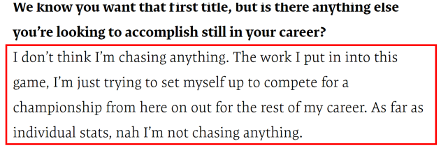 记者还问哈登除了生涯首冠,还有什么想在职业生涯里完成的其他目标?哈登说:“我不认为我在追逐任何东西,我只是想付出努力,在生涯余下时间里为总冠军而战。个人数据方面,我不会再追逐任何东西。”