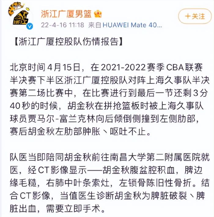 来源:360直播04-16 11:50360直播04月16日讯 ,来自浙江广厦俱乐部官方发布的消息,广厦内线王牌胡金秋在和上海的第二场比赛中受伤离场,而赛后医院给出的检查报告触目惊心!