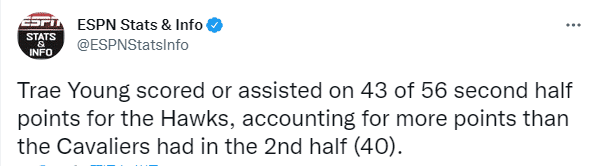 下半场,特雷-杨第三节开启得分模式,单节6投4中独砍16分5助攻,带队单节33-23追回10分,强势回应骑士球迷的辱骂声,末节吹杨依旧不可阻挡,单节又轰下16分,最终带队拿下胜利;期间特雷-杨不仅跳舞庆祝,而且赛后,特雷-杨把球扔向空中,并且第一时间冲着骑士球迷挥手说再见。