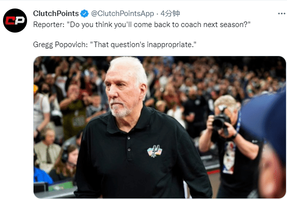 赛后鹈鹕众球员拥抱波波维奇,这会是老爷子执教生涯最后一战吗?波波维奇本人回应:这个问题不合适;输球后马刺名宿吉诺比利一脸沮丧和生气的样子,马刺官方发推写道:这不是我们想要的结果,但为他们战斗而自豪。