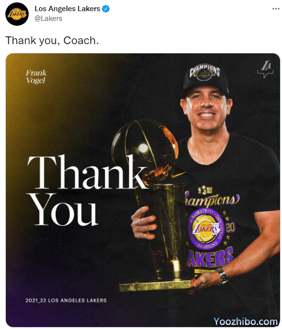 来源:360直播04-12 11:04360直播04月12日讯 ,2021-22赛季常规赛结束的第一天,洛杉矶湖人正式宣布解雇主教练沃格尔,官推晒沃格尔捧杯照,并且配文写道:谢谢你,教练。