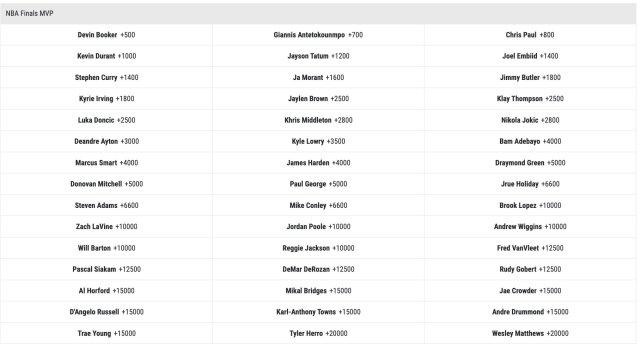第1-15位:1.布克(+500)、2.字母哥(+700)、3.保罗(+800)、4.杜兰特(+1000)、5.塔图姆(+1200)、6.恩比德(+1400)、6.库里(+1400)、8.莫兰特(+1600)、9.巴特勒(+1800)、9.欧文(+1800)、11.布朗(+2500)、11.克莱(+2500)、11.东契奇(+2500)、14、米德尔顿(+2800)、14.约基奇(+2800);