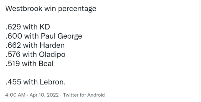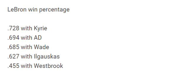 不少球迷认为这并不是威少一个人的锅,只能说明威少不适合詹姆斯,不适合湖人的体系。很快,威少与另外五位明星队友合作的胜率也曝光了。