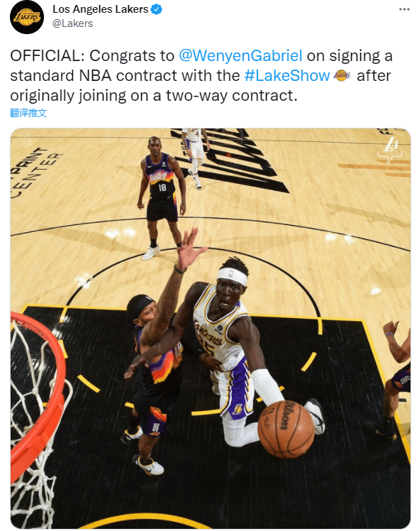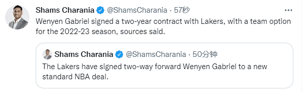 名记shams跟进报道,加布里埃尔和湖人新签一份2年合同,湖人拥有2022-23赛季的球队选项。