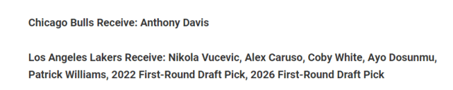 这笔交易的具体方案是湖人送出浓眉,得到公牛的武切维奇、卡鲁索、科比-怀特、多森姆、帕特里克-威廉姆斯、2022年的首轮签和2026年的首轮签。这笔交易对双方有何帮助?