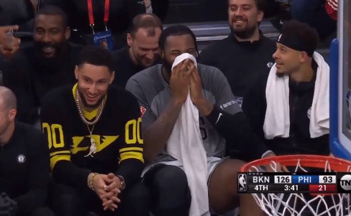 篮网全场吊打76人,第一节40-23领先17分,第二节32-28、第三节30-19早早打花比赛,末节杜兰特不用上场,镜头多次拍到杜兰特咧嘴大笑,庄神坐在替补席笑得前仰后合,西蒙斯也哈哈大笑,篮网赢球太开心。