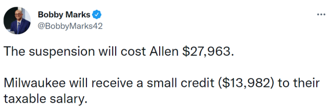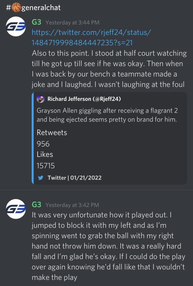阿伦还转发了理查德-杰弗森的一条社媒,社媒的内容是关于自己在二级恶意犯规后还露出笑容。杰弗森的评价是“这样还能笑出来,对他来说倒是很适合。”
