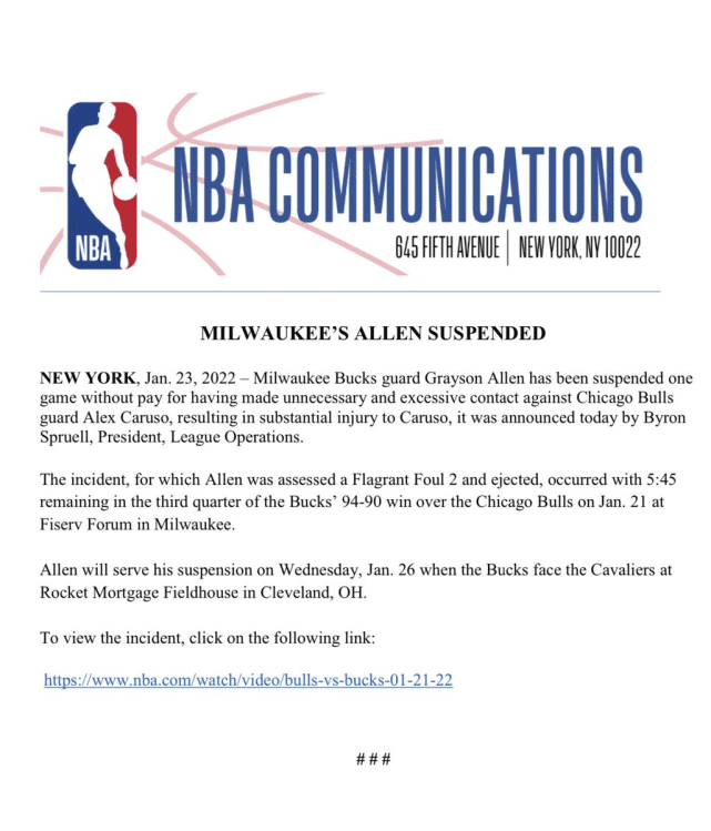 NBA官宣禁赛阿伦一场!本人回应弄伤卡鲁索:笑容与恶犯无关