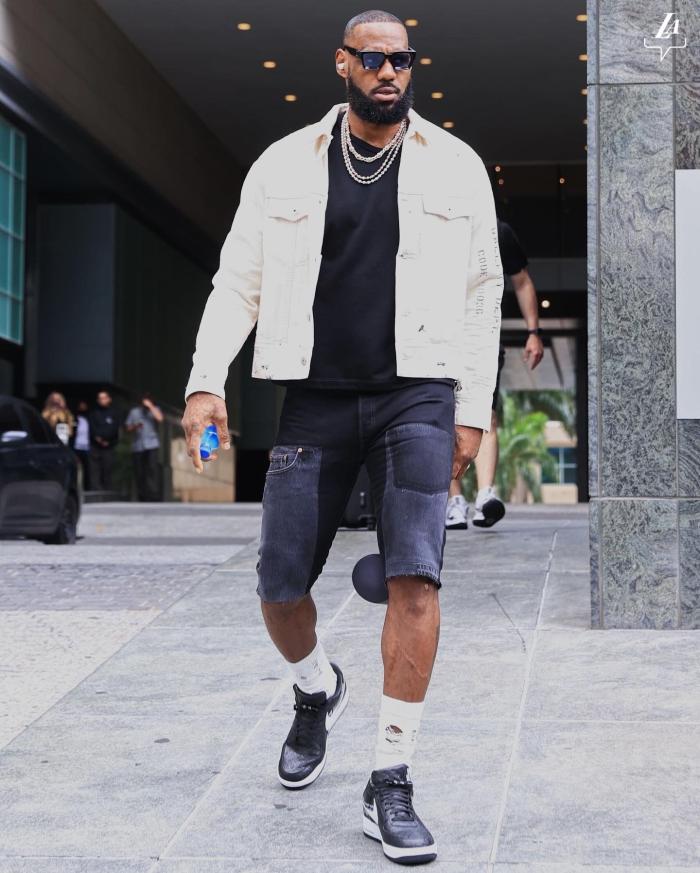 大战之前,湖人官方晒出球员入场照,詹姆斯佩戴墨镜霸气出镜,身穿白色夹克和牛仔短裤,步伐依旧霸气无比。