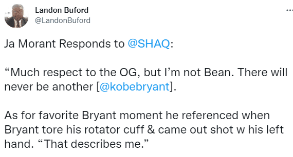 对此莫兰特回应奥尼尔:非常尊重老大哥,但我不是科比(Bean是科比的中间名),再也不会有另一个科比-布莱恩特。