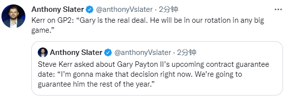 勇士背靠背对阵替补赛前,科尔谈到小佩顿转正合同的话题,他表示:我现在就要做出决定,我们将把他的合同转成保障合同;科尔还表示加里太棒了,在任何重大比赛中,他都会出现在我们的轮换阵容中。