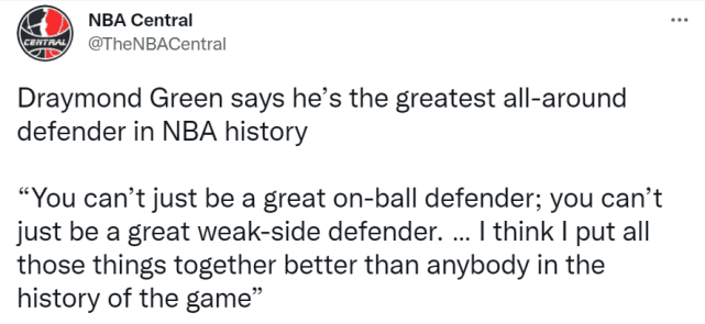 “你不能只是在防守有球时很出色,你不能只是一个很好的弱侧防守者,你必须把所有这些东西都放在一起。当你看到防守端时,我认为我把所有这一切都结合在一起了,而且做得比历史上任何人都好。”格林在采访中说道。
