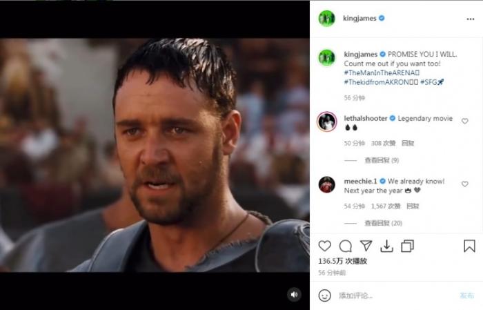 昨日老詹转发了一段电影《角斗士》中的经典台词“我将会复仇,不论今生还是来世。(And I will have my vengeance, in this life or the next)”“向你保证我会的,如果你想把我排除在外的话,尽管这么做吧。”似乎是在暗指下赛季自己将王者归来!