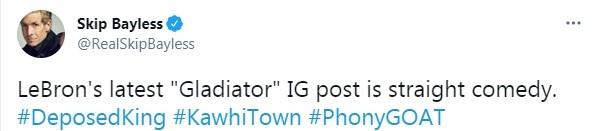 当然了,他的这番操作又引来了詹黑的不满,篮球评论员Skip更新个人社交媒体,写道:“詹姆斯最新的一条关于《角斗士》的ins就是笑话!#被废黜国王(Deposed King)#小卡的城镇(Kawhi Town)#虚假的GOAT(Phony GOAT)”真是追着老詹怼。