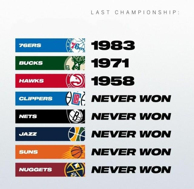 来源:360直播06-07 15:10360直播讯 北京时间6月7日,随着快船击败独行侠,本赛季的八强已经全部产生。他们是东部的费城、篮网、雄鹿、老鹰,西部的爵士、太阳、快船和掘金。美媒很快回顾了八支球队上一次夺冠的时间,其中竟有五支球队在队史上从未夺冠。而其他三支球队,最近的一次夺冠也要追溯到1983年,也就是38年前。