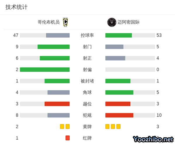 第45分钟,迈阿密先开记录!弗雷后场长传球到弧顶,梅西胸部停球后防守球员解围打在梅西身上梅西顺势推射破门,哥伦布0-1迈阿密。