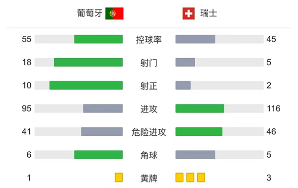 全场比赛结束,葡萄牙主场4-0大胜瑞士。