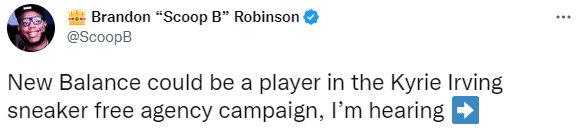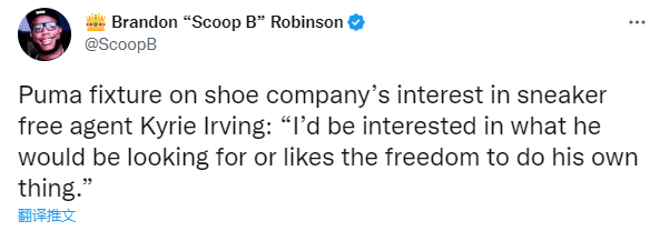 Brandon Robinson报道,彪马品牌对球鞋自由球员欧文感兴趣,他们对欧文正在寻找的东西以及自由地做自己想做的事感兴趣;New Balance新百伦也对欧文感兴趣。