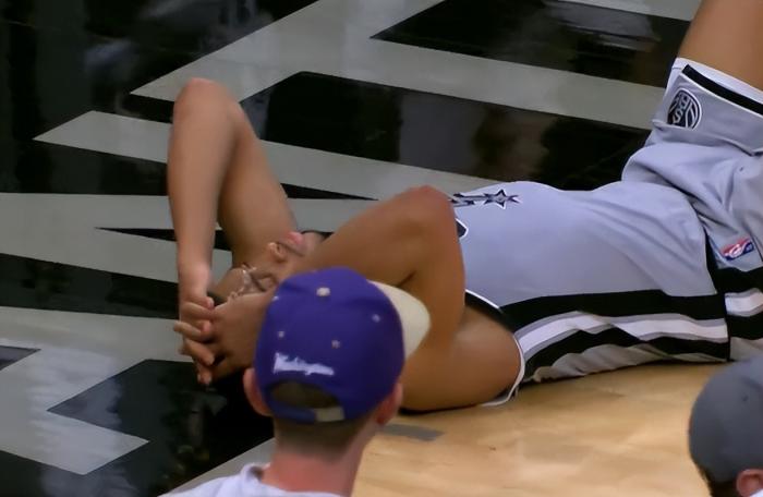 但就是这个把握性很大的上篮,篮球鬼使神差涮了一圈,滚出了篮筐。马刺就此以1分惜败给灰熊,连胜遭到终结。马刺球员和球迷也是非常沮丧,他们纷纷抱头,显得极为失落。凯尔登约翰逊同样抱头沮丧,随后用衣服蒙住头。