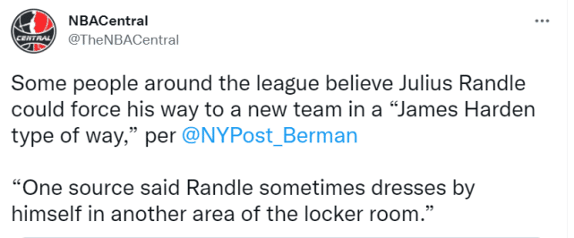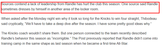 据《纽约邮报》马克-柏曼报道,NBA的圈内人士相信,尼克斯球星兰德尔会以“詹姆斯-哈登的方式”来迫使尼克斯把自己交易到一支新的球队。消息源透露,兰德尔有时候甚至会走到更衣室的另一头去换衣服,和队友显得有些格格不入。