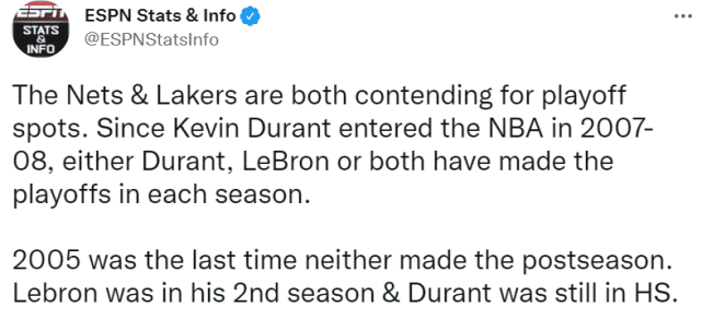 如今,杜兰特和詹姆斯都在为晋级季后赛而努力。ESPN数据显示,自从杜兰特2007-08赛季进入NBA以来,杜兰特和詹姆斯从未同时无缘季后赛。上一次NBA季后赛同时没有詹杜的身影,已经要追溯到2005年,那是詹姆斯的生涯第二季,杜兰特还在高中打球。
