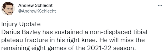 雷霆官方今日宣布,贝兹利遭遇右膝关节胫骨平台无位移骨折,将缺席本赛季剩余的八场比赛;本赛季贝兹利为雷霆出战69场,场均出场27.9分钟,得到10.8分6.3篮板1.4助攻0.8抢断1盖帽。此前多尔特、吉迪也因伤赛季报销。