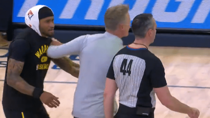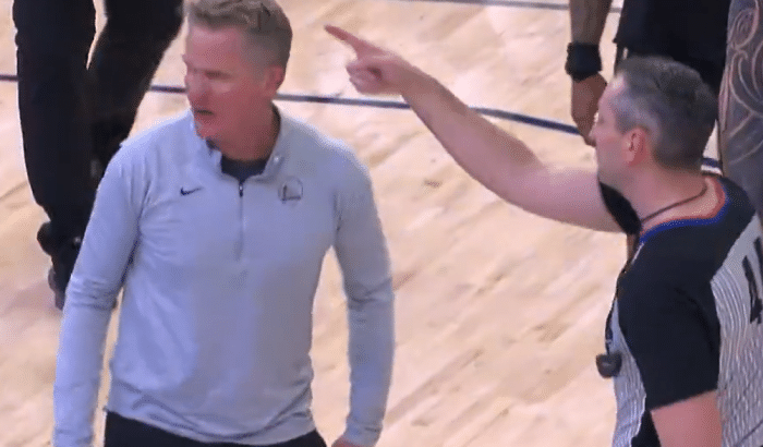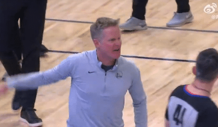 而半场哨声吹响之后,勇士主帅科尔难以抑制自己内心的怒火。他追着裁判怒骂,面红耳赤。裁判也忍无可忍,直接吹罚科尔两个技术犯规,将他驱逐。科尔依然没有平息怒火,试图找另外裁判理论。好在勇士教练和球员将科尔拦下。