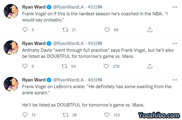 湖人记者Kyle Goon发推:一个发人深思的数据:在2019-20赛季,詹姆斯和戴维斯是湖人队出场次数最多的两人组合,出战59场,上场时间1455分钟;在最近两个赛季中,詹姆斯和戴维斯仅仅一起打了 48 场比赛和 1,147 分钟。