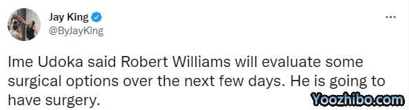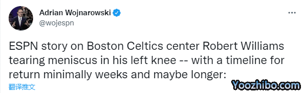 据名记沃纳罗斯基报道,凯尔特人首发中锋罗伯特-威廉姆斯(罗威)遭遇左膝半月板撕裂的伤病,之后凯尔特人主帅乌度卡表示罗威将在接下来的几天他接受手术治疗,他的伤停是对绿军的一大重创,本赛季能否复出取决于他做什么样的手术。