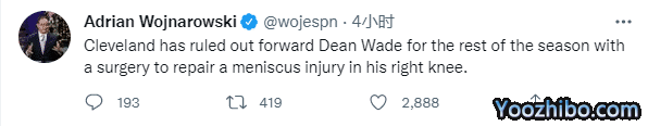 据名记沃纳罗斯基报道,骑士前锋迪恩-韦德接受右膝半月板手术,将缺席本赛季剩余比赛;本赛季为骑士出战51场比赛,场均5.3分2.9篮板1助攻,目前骑士41胜33负排名东部第七。