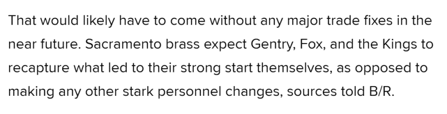 消息人士透露,除了巴格利三世,国王不想进行涉及核心球员的大交易。他们希望金特里和福克斯能率领这支球队走出困局,重新找回开季初的状态。目前,国王6胜12负,排名西部第12位。