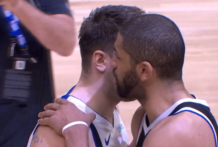 比赛结束之后,东契奇站在场地内,先是和巴图姆拥抱致意。巴图姆是这轮系列赛防守东契奇效果最好的球员之一,这位老将在快船重新展示了自己的价值。随后保罗乔治上来,和东契奇长时间交谈并拥抱。乔治不知道说了什么,还让东契奇露出了一丝笑容。此时,很多快船球员已经围到东契奇身旁,其中就包括王牌莱昂纳德。