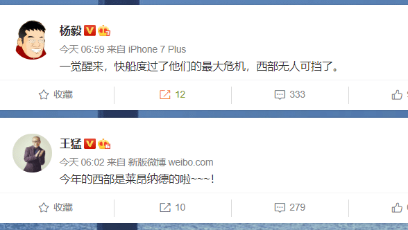 不过看起来各路名嘴认为快船晋级的概率更大。杨毅写道:“一觉醒来,快船度过了他们的最大危机,西部无人可挡了。”而王猛也写道:“今年的西部是莱昂纳德的啦。”而马健也认为:“目前状态不错的快船非常有希望再次晋级下一轮。”