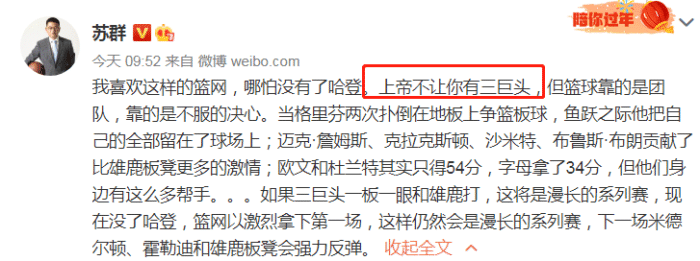 而苏群老师还盛赞了篮网,他喜欢这支篮网队。“我喜欢这样的篮网,哪怕没有了哈登。上帝不让你有三巨头,但篮球靠的是团队,靠的是不服的决心。当格里芬两次扑倒在地板上争篮板球,鱼跃之际他把自己的全部留在了球场上。迈克詹姆斯、克拉克斯顿、沙米特、布鲁斯·布朗贡献了比雄鹿板凳更多的激情”。