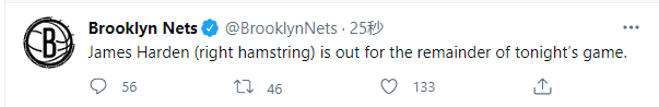 国内名嘴苏群更新动态,写道:今天哈登不会回来了,他第一节打了43秒,拉伤大腿后侧,去了更衣室再也没有回来。如果没有哈登,这一轮篮网估计要凉凉。