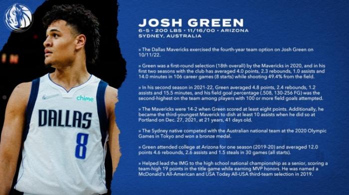 独行侠官宣行后卫约什-格林的第四年(2023-24赛季)球队选项,23-24赛季的薪水是476万美元;约什-格林是202年18号秀,上赛季为独行侠出战67场比赛,场均拿到4.8分2.4篮板1.2助攻。