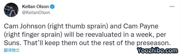 24直播网10月08日,太阳队连伤两大主力,据太阳随队记者Kellan Olson报道,卡梅隆-约翰逊(右拇指扭伤)和佩恩(右手指扭伤)都将在一周内重新评估伤情,他们都将无缘季前赛剩余比赛。