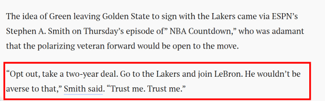 格林有可能会拒绝执行下赛季的选项,在明年夏天成为一名自由球员。名嘴斯蒂芬-A-史密斯认为格林的下一站是洛杉矶湖人,他坚信格林对离开勇士持开放态度。