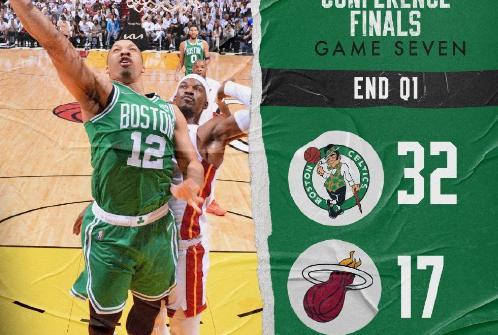 24直播网05月30日讯 ,NBA东部决赛第7场打响。结果此役开场,客场作战的凯尔特人便打出了非常猛烈的进攻输出,20-7梦幻开局。随后凯尔特人继续扩大优势,首节结束已经32-17领先热火15分。对于热火来说,他们再度被逼入绝境。