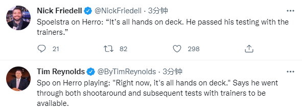 希罗因腹股沟伤势已连续缺战三场,今年季后赛,希罗场均可以得到13.5分4.1篮板2.9助攻0.6抢断;对于希罗复出,斯波尔斯特拉表示:他已经完全准备就绪,通过了训练师安排的所有测试,并在今早参加了投篮训练。
