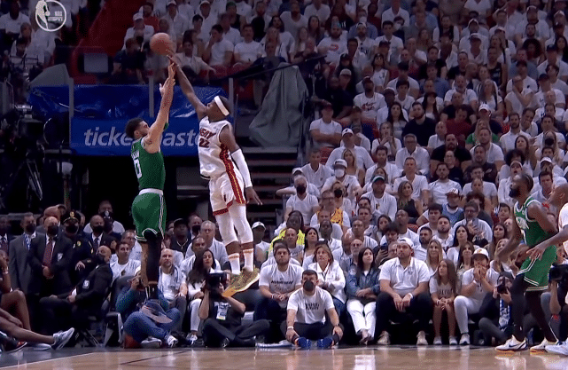 末节,巴特勒休息时,热火被绿军打出10-3反扑高潮;巴特勒回来后迎射塔图姆,后者强势回应三分,两队展开疯狂对攻大战,关键时刻,巴特勒不讲理中投,外线大帽塔图姆,强突造犯规两罚全中,单打塔图姆又发狠庆祝,最终热火捍卫主场,稳稳拿下东决G1。