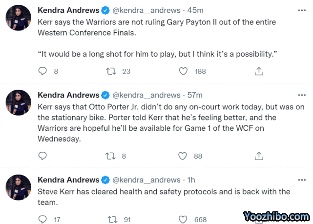 24直播网05月16日讯 ,勇士喜迎三大利好:科尔已经解除健康安全协议,回归勇士;波特伤势好转,有望G1复出;勇士并未排除小佩顿西决复出的可能性。