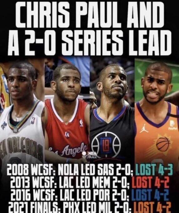 他在2008年、2013年、2016年和2021年都曾经在2-0领先的情况下被翻盘。在这次被翻盘前,太阳在去年总决赛2-0领先,结果连输4场,被雄鹿夺走冠军。另外,算上这场比赛,保罗抢七已经5连败了!