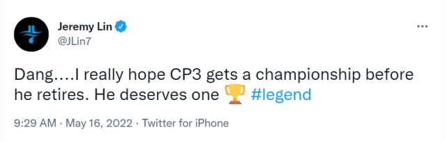 林书豪在社媒上写道:“”该死....我真希望保罗能在退役前夺得总冠军,他绝对值得拥有一座总冠军奖杯#传奇!”但保罗的冠军梦真的难圆了。这个赛季多好的机会,照样没有把握住。有球迷晒出了朗多2009年对保罗的那句无冠诅咒:“我已经拿到一个戒指了,但你永远不会拿到。”朗多的诅咒或许会成为现实。