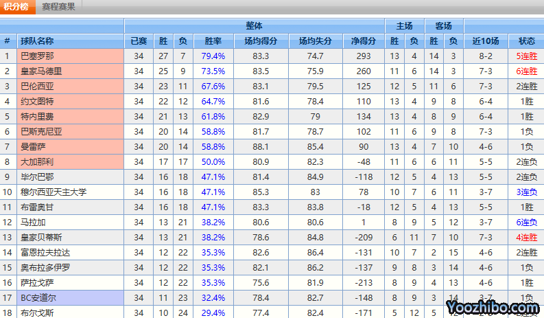 24直播网05月16日讯 本赛季西班牙篮球甲级联赛常规赛正式落下帷幕,巴塞罗那27胜7负排名第一,力压皇家马德里的25胜9负,一共18支球队,前8名晋级到季后赛,最后一名垫底的球队将会降级。很遗憾,本赛季西甲垫底的球队是布尔戈斯,他们战绩定格在10胜24负,排名倒数第一,降级到乙级联赛。
