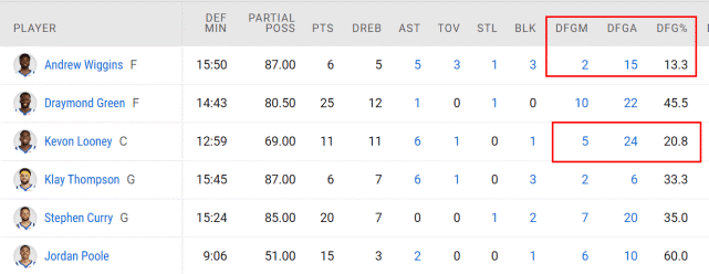 24直播网05月15日讯 勇士在G6一战中110-96击败灰熊,以4-2的总比分晋级。96分也是灰熊在这轮系列赛中的单场最低分。NBA官方公布了勇士和灰熊G6的防守数据,维金斯和卢尼在防守端表现强悍,两人合计只让对手39投7中,命中率不到18%!