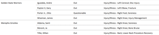 24直播网05月13日讯 ,勇士和灰熊提交了G6的伤病报告,双方6人确定缺席G6!勇士一方,伊戈达拉因颈部伤势缺阵,小佩顿因左肘骨折缺阵,怀斯曼因右膝伤病管理缺阵,波特右脚酸痛,目前是questionable(出场成疑,50%可能上场)。灰熊一方,确定缺阵的是蒂利(背部伤病)、阿尔达玛(膝伤),莫兰特(右膝骨挫伤)。莫兰特已经确定无缘G6一战,此前ESPN报道莫兰特预计赛季报销。