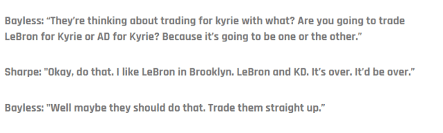 贝勒斯说:“他们想用谁去换来凯里(欧文)?他们用詹姆斯还是戴维斯去换欧文?因为只能二选其一了吧。”