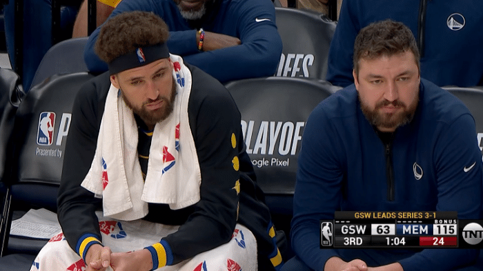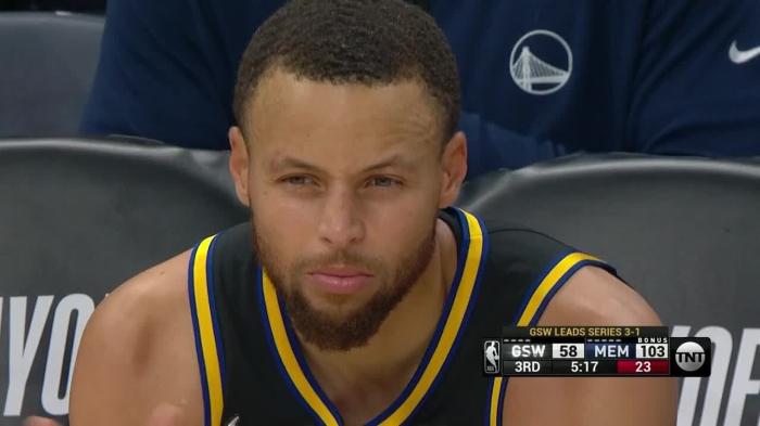 下半场,奥托-波特因右脚疼痛而退出比赛,勇士变阵安排别利察首发,如此阵容继续被灰熊按在地板上摩擦,被打26-6瞬间落后到将近50分,第三节6分44秒库里和格林下场,之后汤普森也下场休息,勇士三节落后52分,期间灰熊球迷集体高呼痛揍勇士,库里一脸苦笑,格林却跳舞十分享受;比赛早早沦为垃圾时间,末节勇士主力不在上场,最终勇士遭遇耻辱惨败。